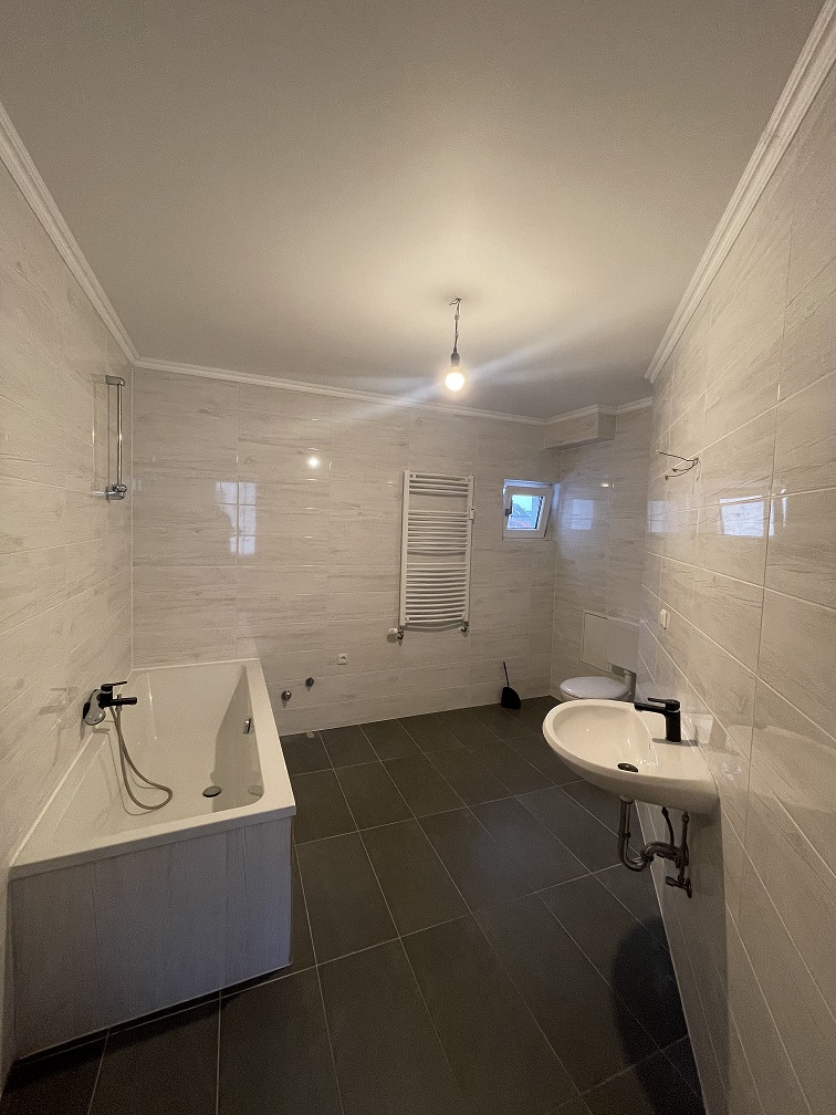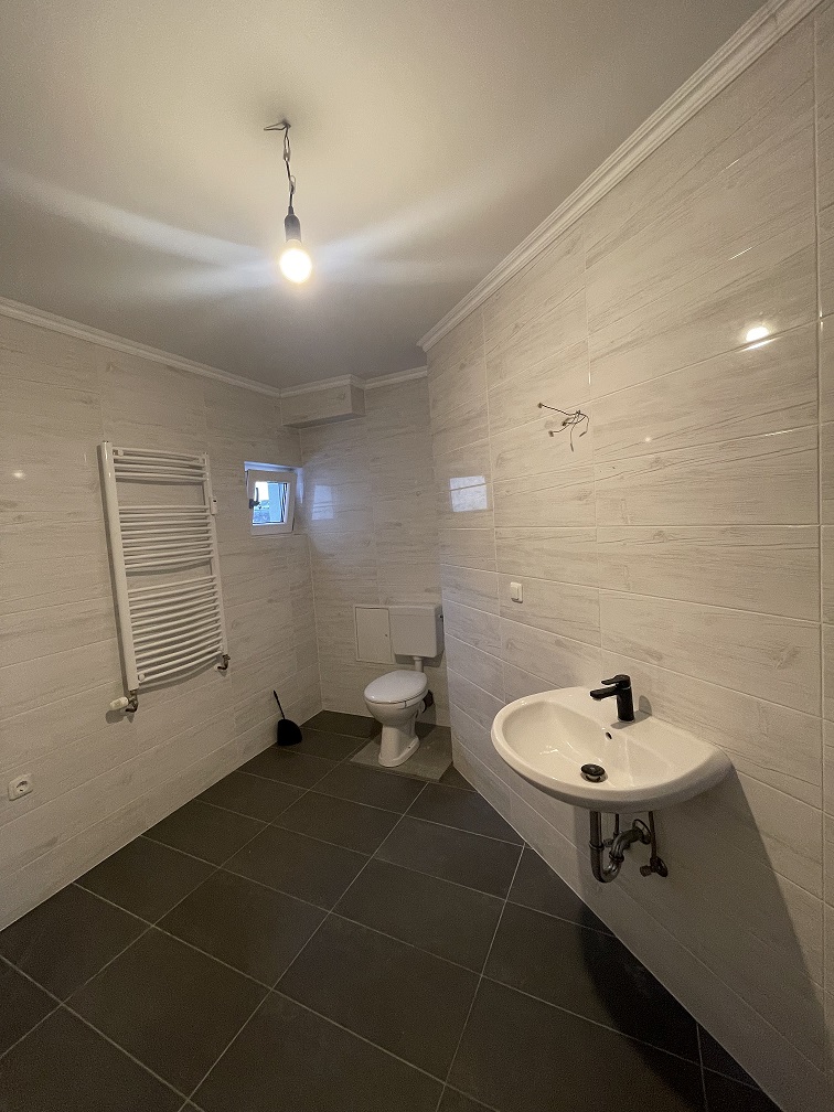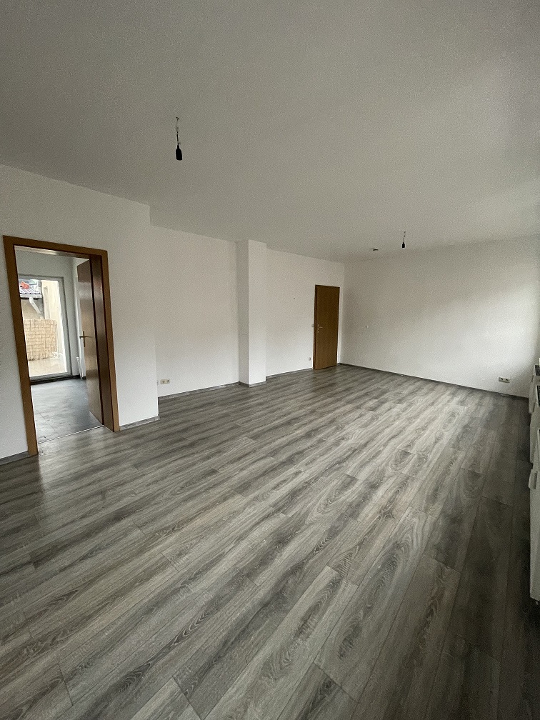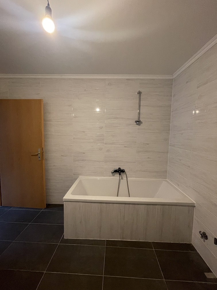 Die Wohnung ist aufgeteilt in einen Flur, einem großzügigen Wohnzimmer, einem Küchenraum mit Zugang zur Dachterrasse, einem Zwischenflur, einem Badezimmer mit Badewanne und WC und 2 weiteren Zimmern.